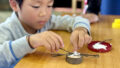 完成したこまは、すぐに上手に回せた子もいれば、少しバランスがとれておらず、すぐ倒れてしまうような子もいました。(なかには逆立ちごまになっていた子も!)